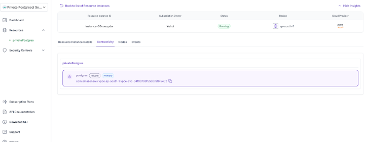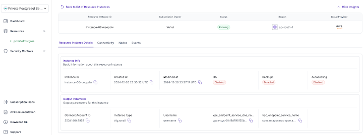 In addition to above, customers can also access additional information about the PostgreSQL deployment in the Resource Instance Details tab. The SaaS offering template provides the capability to define essential information about the private PostgreSQL deployment that customers need to be aware of, and this information is displayed in the UI portal as shown below.