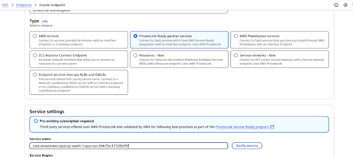 For detailed instructions, refer to the AWS Documentation on Connecting to an Endpoint Service.