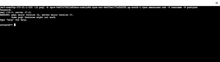 After completing these steps, customers will be able to connect to the private PostgreSQL instance from within the target account VPC. Below is an example of how to establish a connection from an EC2 client.